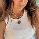 This sacred charm of Saint Michael & Saint Anne is sterling silver. It measures 5/8".