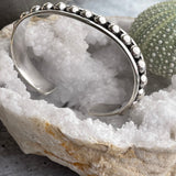 Our beaded cuff is an everyday go to! The sterling silver cuff fits wrists up to 7 3/4 inches. The beaded cuff is one of our most popular pieces and is often paired with our handwritten thin cuff and is great with any stackable bracelets.