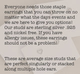 Everyone needs those cute sterling silver stud earrings that you can throw on no matter what the day's events and we are here to give you options! Our studs are sterling silver .925 and nickel free. If you have allergy issues, these nickel-free sterling silver earrings should not be a problem!