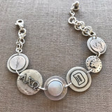 This particular personalized charm bracelet was a custom piece made for a friend whose daughter was graduating from DePauw University. I love how it turned out and want to offer it now to all of you. The engraved sterling silver charm bracelet will have six discs that you may customize. You have the option of 1-2 handwritten disc, logos, initials, monograms, dates, etc.