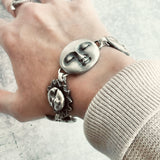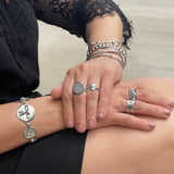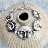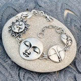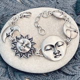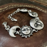 The name of this bracelet says it all. This beautiful piece combines all of our favorite hand cast moons and sun into one amazing bracelet. It’s a nice weight for a statement piece that will draw attention to your wrist. Entirely sterling silver, our moon and sun statement bracelet is adjustable from 7 inches to 8 inches.