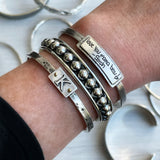 A great personalized cuff to add to your stack! This thin cuff bracelet is made with hammered sterling silver and gold-filled ball accents. The initial cuff can fit wrists from 6 1/2 inches to 7 1/2 inches. If you should need a different size, please email us at info@heidijhale.com.