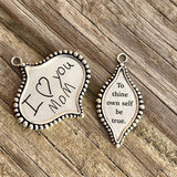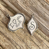 Get these engravable sterling silver pendant/charms with handwriting, a monogram, names, dates, or whatever you want! The large marquis pendant/charm measures 1.5”x1.5”. The thin marquis pendant/charm measures 1.5”x.75”. Both are perfect by themselves or grouped with our other charms.
