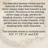 The beautiful faceted citrine and the textures of the different sterling silver chains make this bracelet a one of a kind. The bonus is the sterling silver clasp is huge, perfect for hanging charms. I wouldn’t consider this a heavy or bulky bracelet, it’s a perfect size for everyday wear and stacking with other bracelets.