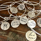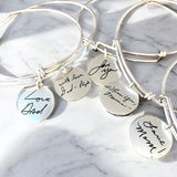 The Handwritten Collection fills the human need to Love and to be Loved while capturing a moment in time. We use actual handwriting and engrave it on a handcrafted charm. You can use your own handwriting, a loved one’s, your child’s, or someone special in your life….the possibilities are endless! Can you imagine the smiles and tears a gift like this personalized handwriting bracelet would bring to the recipient? This sentimental, simple, and unique sterling silver expandable engraved charm bracelet will carry meaning for a lifetime.