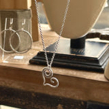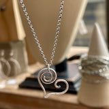 This hand-forged heart is made out of Sterling Silver and measures about 7/8". It comes with an 18" chain, please reach out if you would like a different size chain!