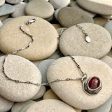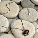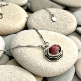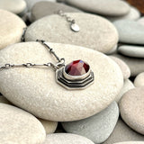 A 15mm x 10mm faceted garnet is framed in a sterling silver bezel stacked on top of layers of silver. The faceted garnet is a magnificent deep wine color! The silver chain is 15 inches adjustable to 17 inches.