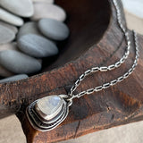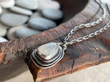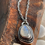 A 10mm x 17mm faceted rainbow moonstone is framed in a sterling silver bezel with layers of textured silver. The stone is magnificent! The silver chain is 18 inches adjustable to 20 inches.