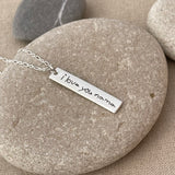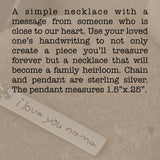 A simple sterling silver rectangle necklace with a message from someone close to your heart. Use your loved one’s handwriting to not only create a piece you’ll treasure forever but a necklace that will become a family heirloom. The chain and pendant are sterling silver. The pendant measures 1.5”x.25”.