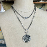 I absolutely love this sterling silver hand necklace. It's my favorite because of the details in the different sterling silver chains used. The clasped silver hand on this necklace also reminds us to "never let go". The ring on the hand does not open, but if you would like to add a charm to your necklace, please add the instructions to your order notes or send us an email and we will make sure your charms get attached! This listing is for two different chain options and both chains are sold separately.