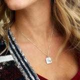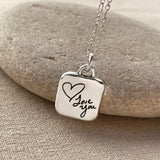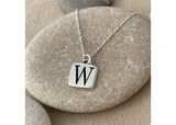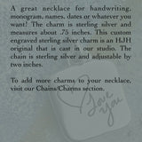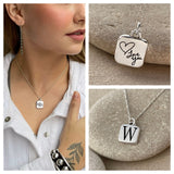 This custom sterling silver square charm necklace is great for handwritten messages, monograms, names, dates, or whatever you want! The charm is sterling silver and measures about .75 inches. This custom engraved sterling silver charm necklace is an HJH original that is cast in our studio. The chain is sterling silver and adjustable by two inches.