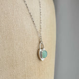 A lovely aqua green 3/8” chrysoprase bezeled on top of a sterling silver heart. Is 20”-22”. If you prefer a different length, please email us at info@heidijhale.com.