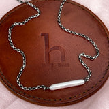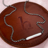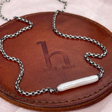 A gorgeous one inch freshwater pearl stick wrapped onto a unique sterling silver chain. The necklace length can be 16”-18” or 18”-20”.