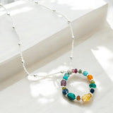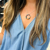 A gorgeous gemstone circular pendant with turquoise, citrine, blue opal, amethyst, pink tourmaline, kyanite, peridot, and aquamarine. The pendant is 1” in diameter.