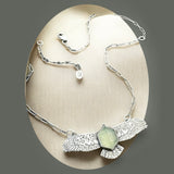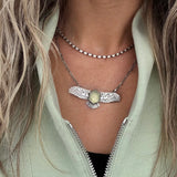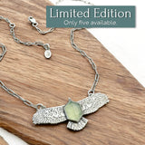 Let your spirit soar. Handcrafted in sterling silver, the Take Flight Necklace features an intricately detailed soaring bird, its wings outstretched and etched with organic, symbolic patterns. At its heart rests a natural faceted prehnite—known for its calming, heart-centered energy—adding a soft, ethereal glow to the piece.