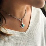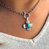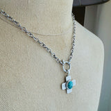 A great necklace that features a 3/4” cross with a bezeled oval turquoise. The sterling silver chain can be worn by itself, with the cross, or add your other charms. You can choose whichever length best suits you.