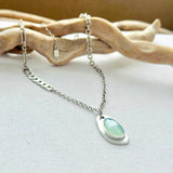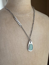 One of my favorite stones is aqua chalcedony (cow-sidney)! The chain is our popular End of Day chain. It’s 16”-18”, but if you’d like it longer, please email us at info@heidijhale.com after you purchase. The pendant is 1.25”.