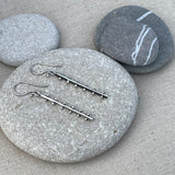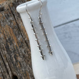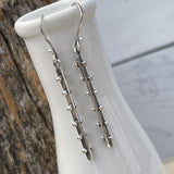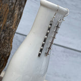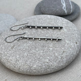 The dotted sterling silver stick earrings are oxidized sterling silver and are approximately 1.5 inches. Oxidized means that they are darkened and then buffed to show the details of the earring.