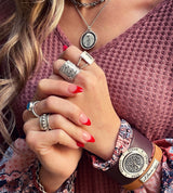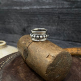 We’ve been asked many times to create a spinner ring and here it is! This sterling silver beaded spinner/worry ring is 15mm wide which is a little over a half inch. Textured on the edges, domed and customized to your size, it will be a conversation piece and keep you busy when you are a little fidgety.