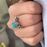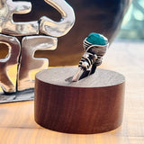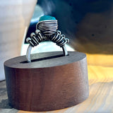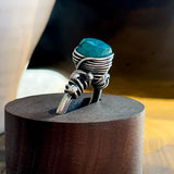 Going back to my roots with this turquoise wrap ring design. I will never lose my love for the wire-wrapped look with oxidized sterling silver and gemstones. It’s a different look that you can’t buy from a store, only an artist. This sterling silver wire-wrap ring features an 8mm faceted turquoise.ise.
