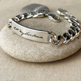 This sterling silver engraved bracelet is a popular one at HJH. It’s the perfect weight for a man’s bracelet, we’ve also made the plate width and length perfectly to suit the size of a man’s wrist. The sterling silver plate is slightly curved to fit comfortably on your wrist.