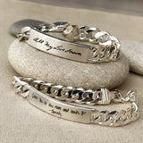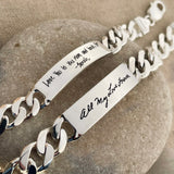 Please keep in mind that everyone’s handwriting is unique, meaning it will engrave differently. The number of words or letters can determine the size of your engraving. One person may have a heavy hand while another’s writing is thin. No two bracelets are alike. We have over 25 artists who do their best to create an engraved sterling silver chain-link bracelet with the handwriting they are given.