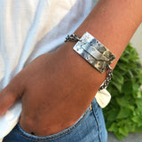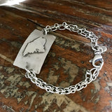 A personalized sterling silver bracelet that represents the love for your state, reminding you of memories past, present or future. The direction your state will lay depends on the state itself. Our artists will determine which looks better.