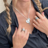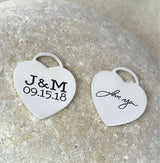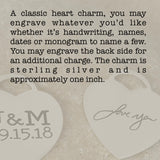 A classic engraved heart charm, you may customize it with handwriting, names, dates, or a monogram to name a few. You may engrave the backside for an additional charge. The sterling silver heart tag is approximately one inch.