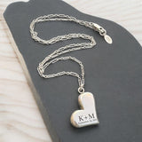 Our sterling silver puffed heart is about 1”. Chain options are 16”, 18”, or 20”. If you need a different length, email us at info@heidijhale.com.